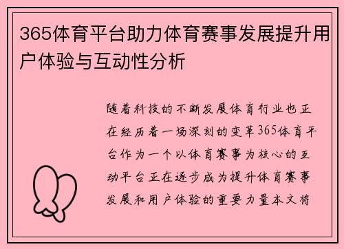 随着科技的不断发展,体育行业也正在经历着一场深刻的变革。365体育平台作为一个以体育赛事为核心的互动平台,正在逐步成为提升体育赛事发展和用户体验的重要力量。本文将从四个方面对365体育平台如何助力体育赛事发展、提升用户体验与互动性进行分析。这些方面包括平台的技术创新、赛事互动的多样性、用户数据分析的精准性以及社区文化的构建。通过这些视角的深入探讨,本文旨在展示365体育平台如何通过优化用户体验,推动体育赛事的全面发展,并为用户带来更加沉浸式的参与感和互动感。
